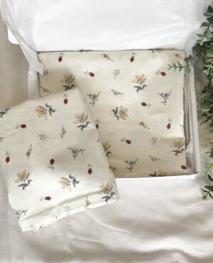 Gjafasett – hvít rúmföt og Jellycat óróí með tónlist – bleik