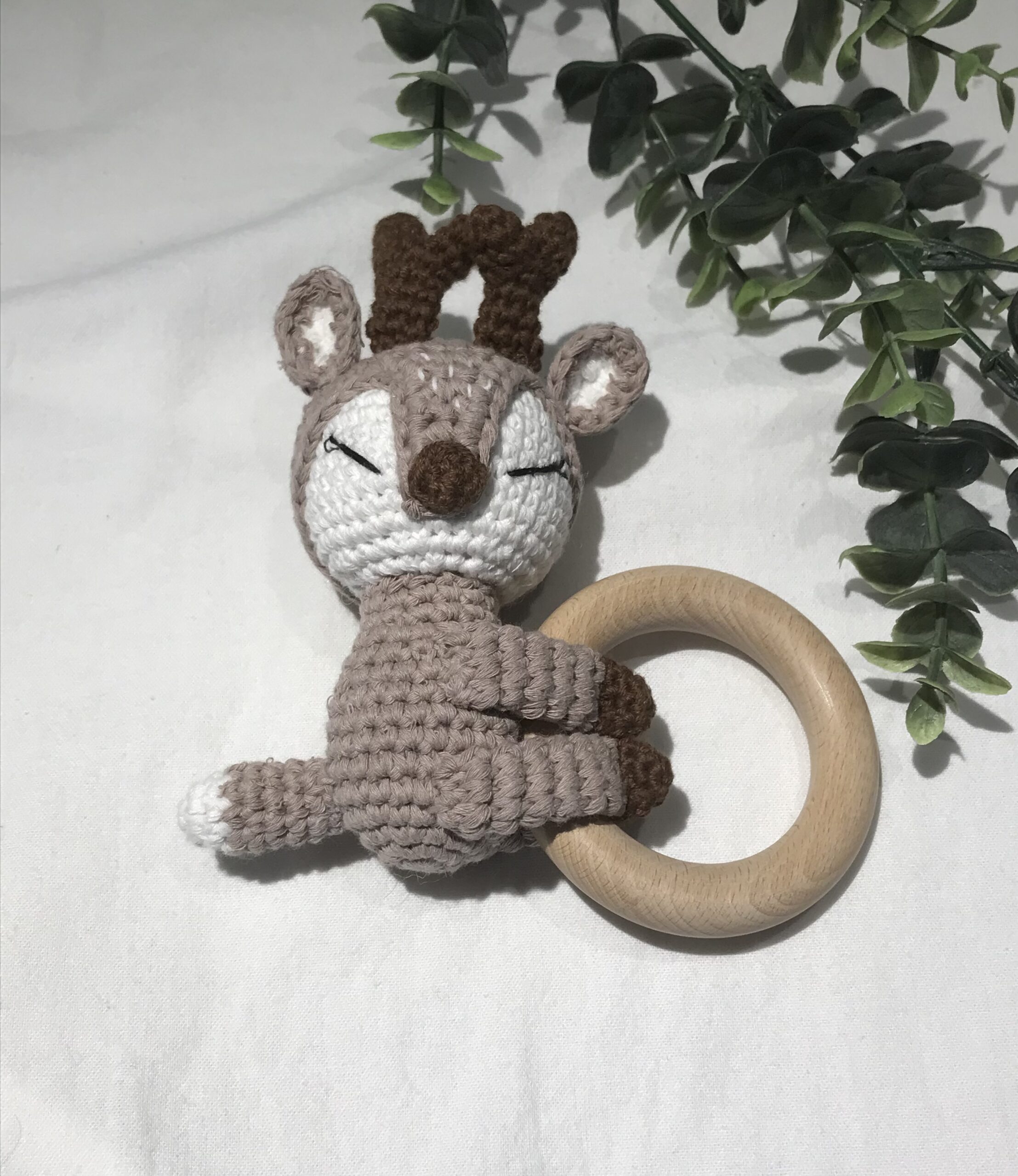 Falleg hekluð hringla með bjöllu innan í og áföstum viðarhring.