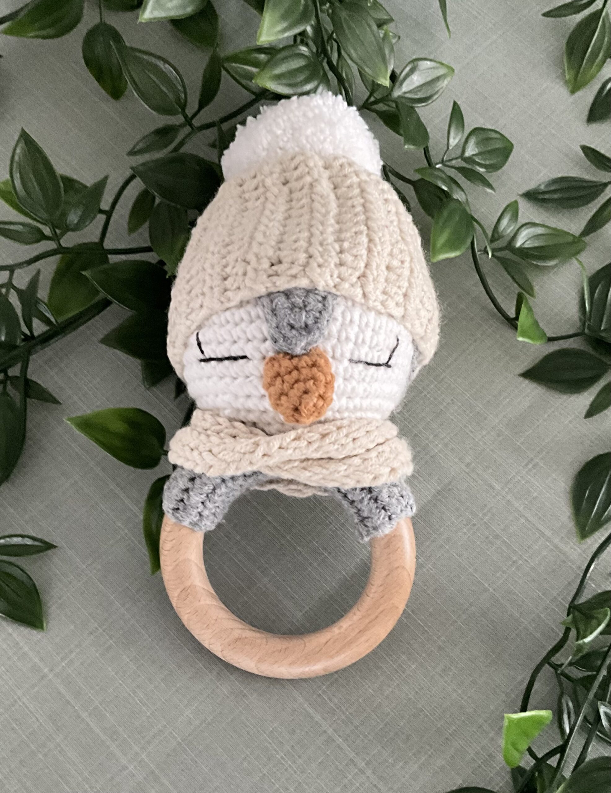 Falleg hekluð hringla með bjöllu innan í og áföstum viðarhring.