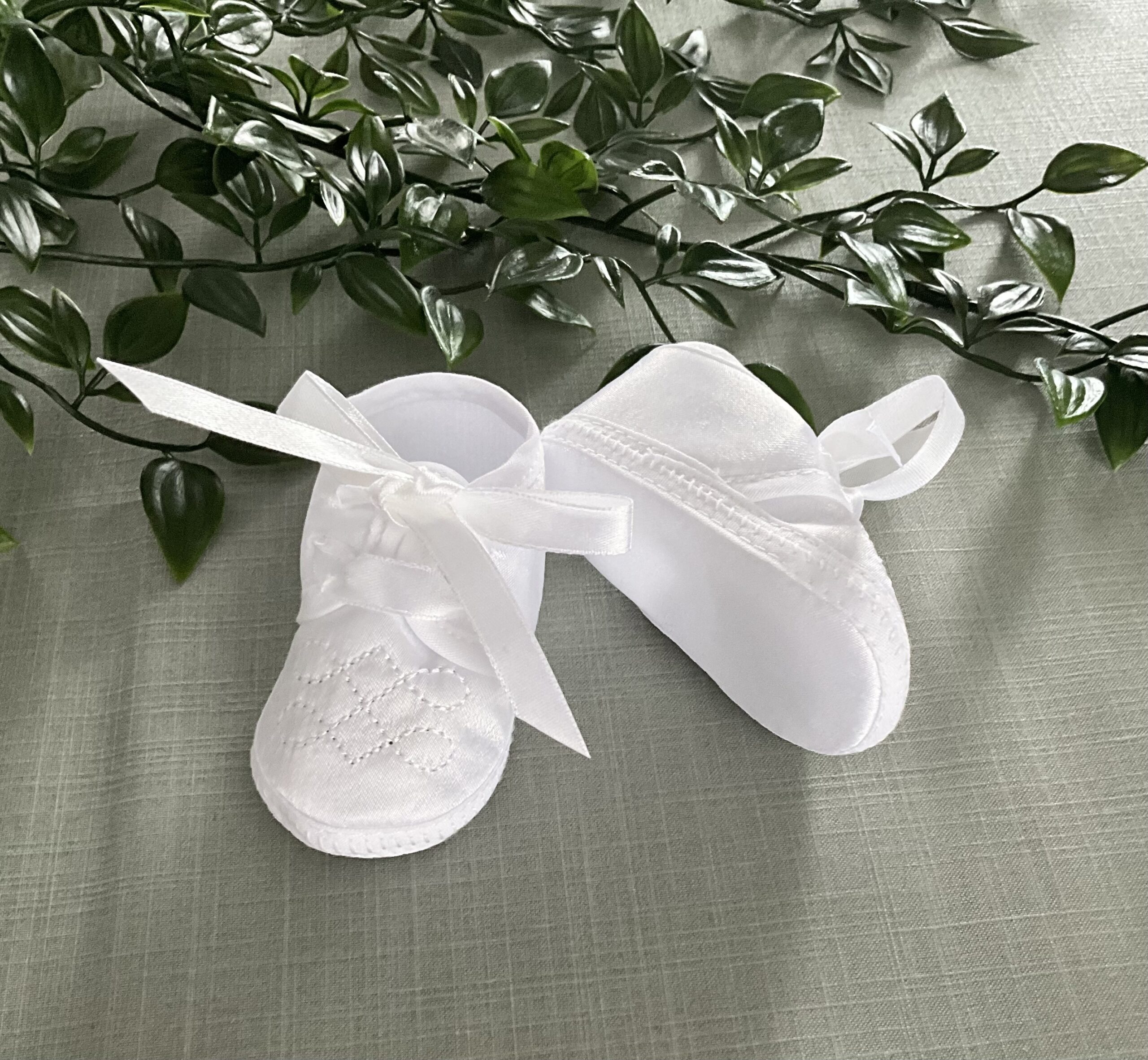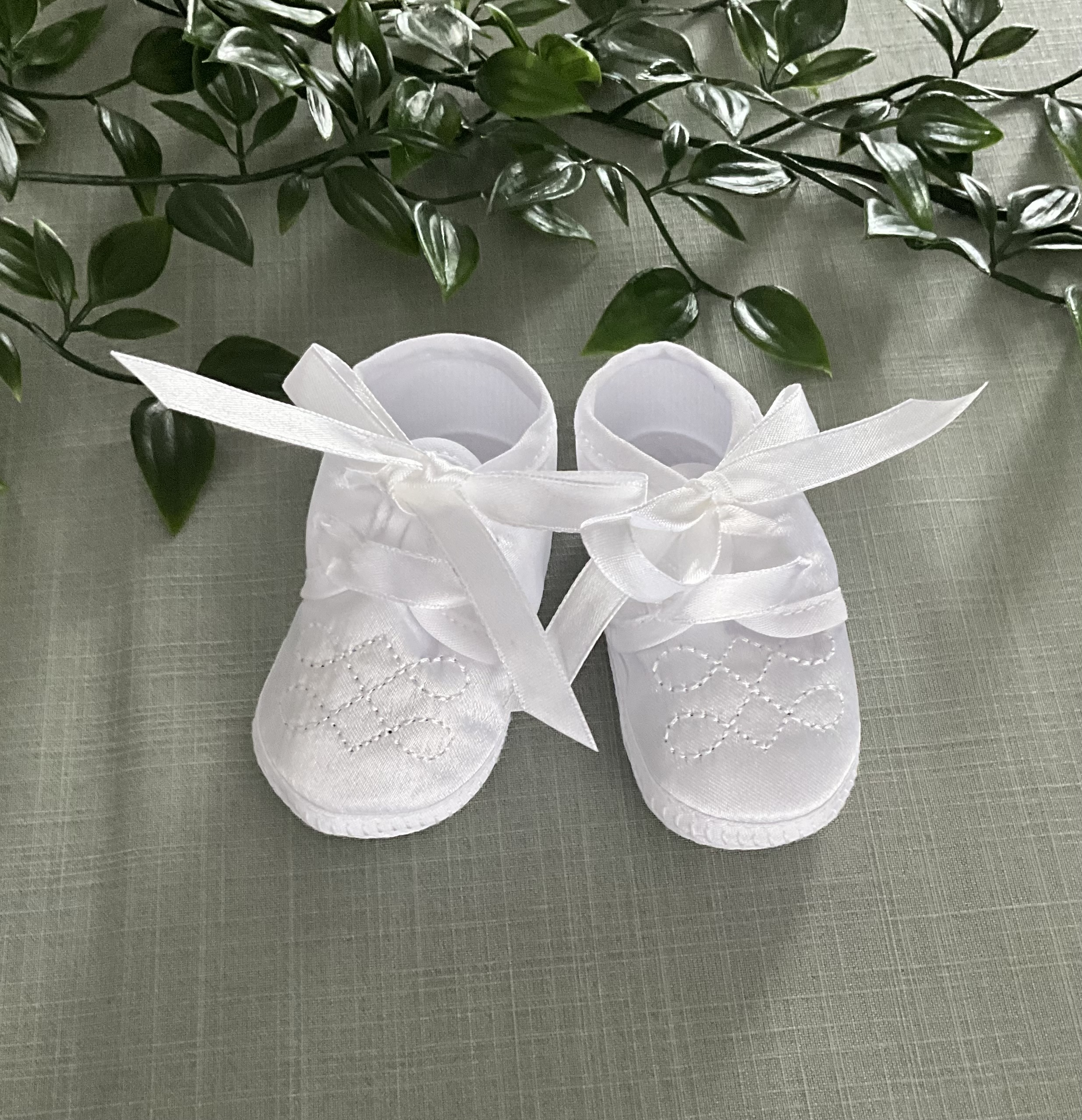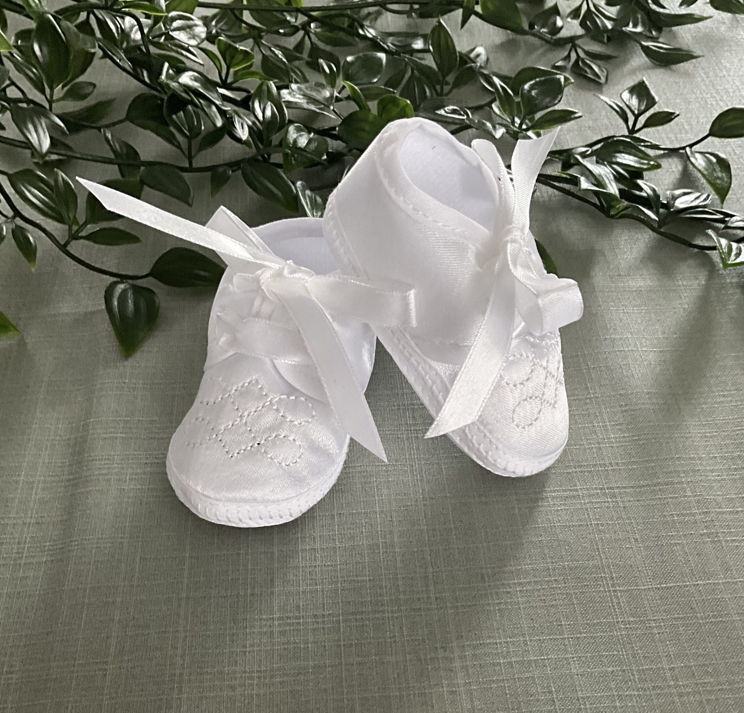 Nýtt – Skírnarskór – satín – hvítir með mynstri á rist